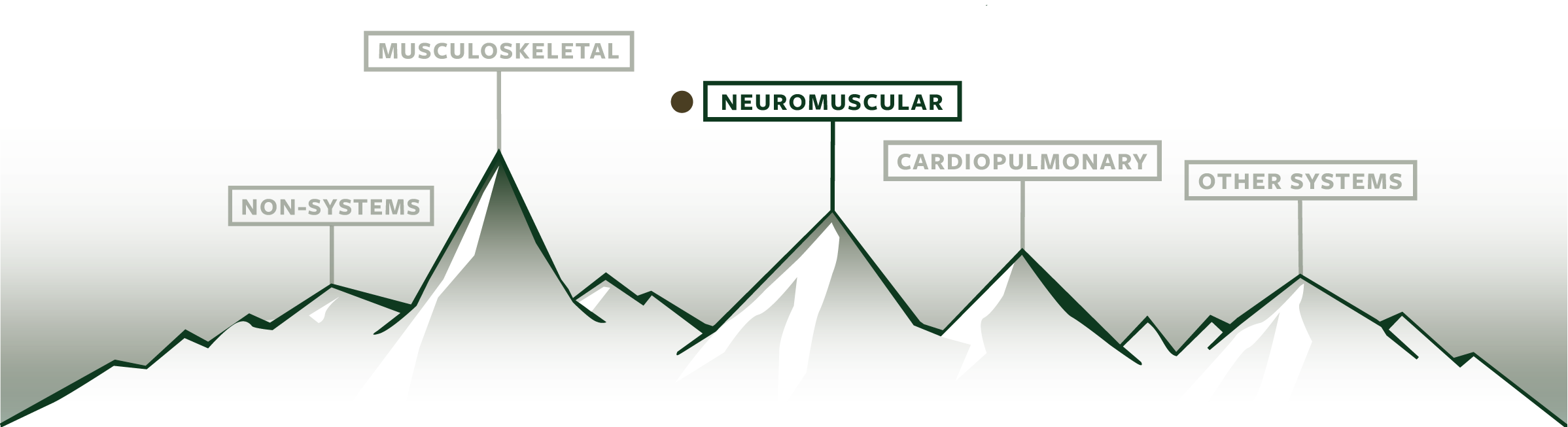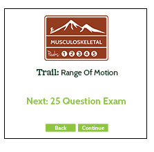Basecamp covers academic core content in five distinct Mountains (Musculoskeletal, Neuromuscular, Cardiopulmonary, Other Systems, and Non-Systems). Within each mountain there are numerous Trails (e.g., anatomy, range of motion, special tests) which represent specific academic subject matter relevant to each Mountain. Collectively Basecamp offers over 140 Trails organized into 25 Peaks.